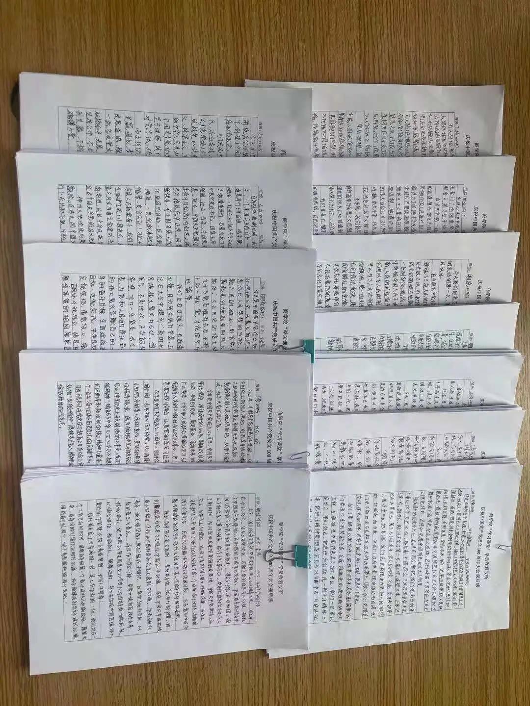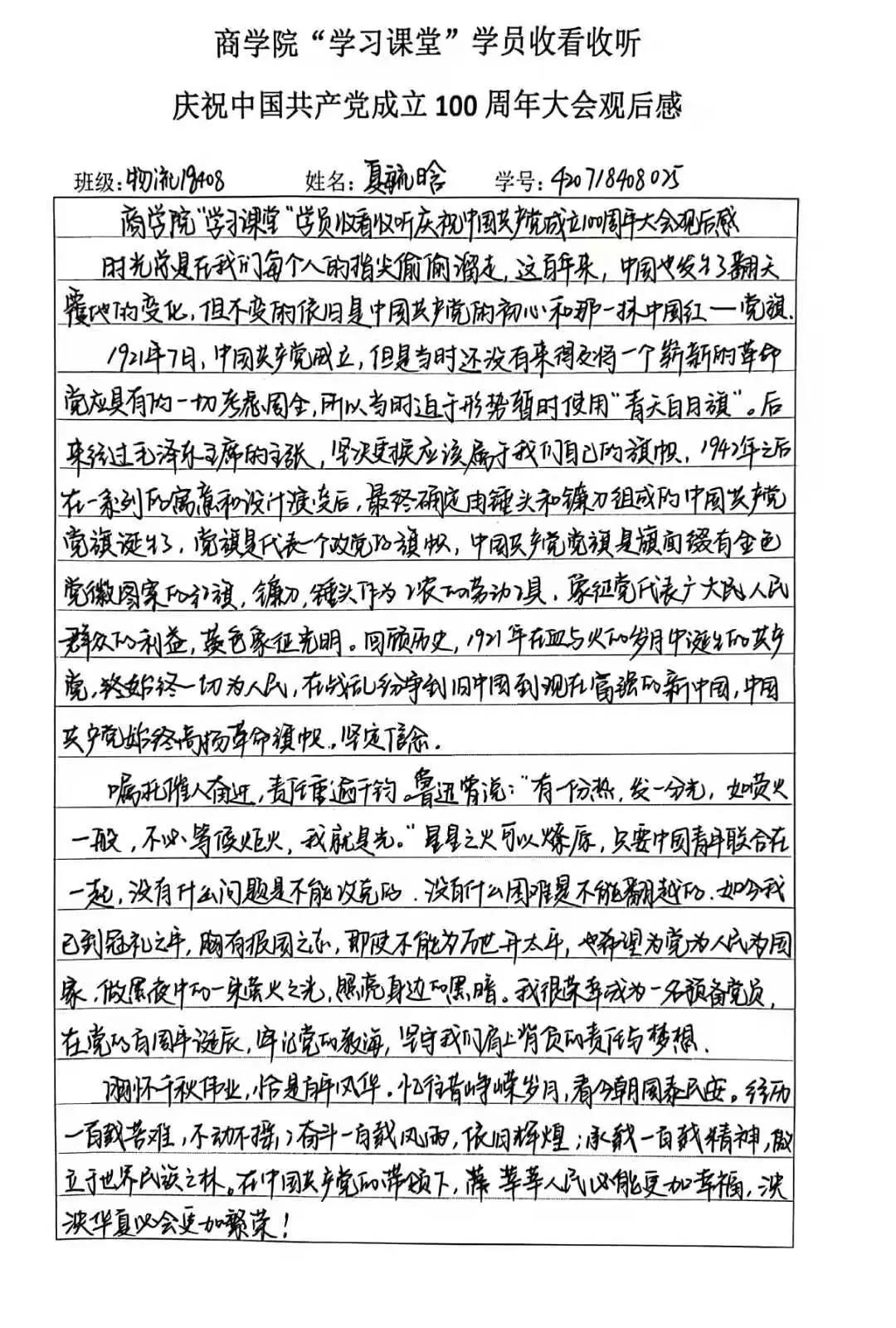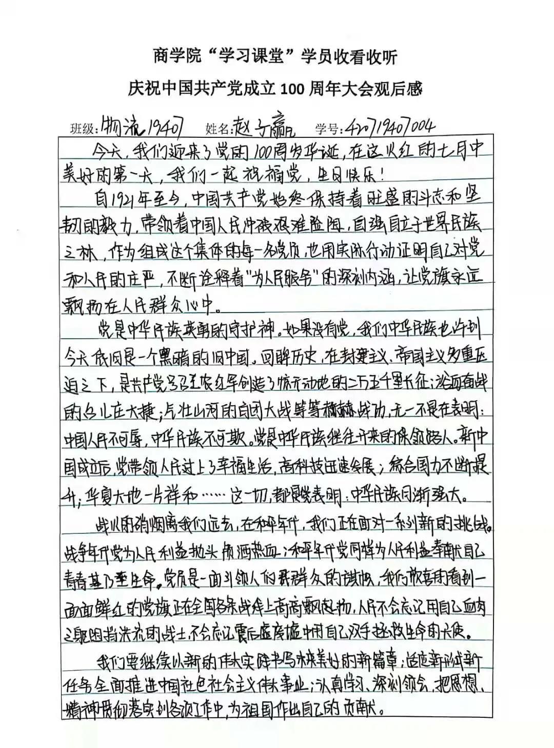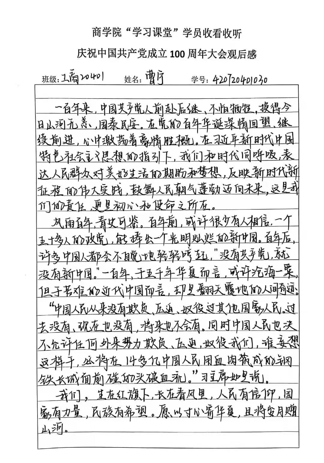 大会直播结束后,怀着久久难以平复的激动心情,我院发起了《商学院“学习课堂”学员收看收听庆祝中国共产党成立一百周年大会观后感》自愿上交活动。活动一经发起,收到了全体同学的热烈反响,从入党积极分子、学生干部、班级干部到普通同学全部上交观后感,清晰工整字迹的背后是我院同学对党的祝福、对祖国的期待,下面是优秀观后感作品展示: