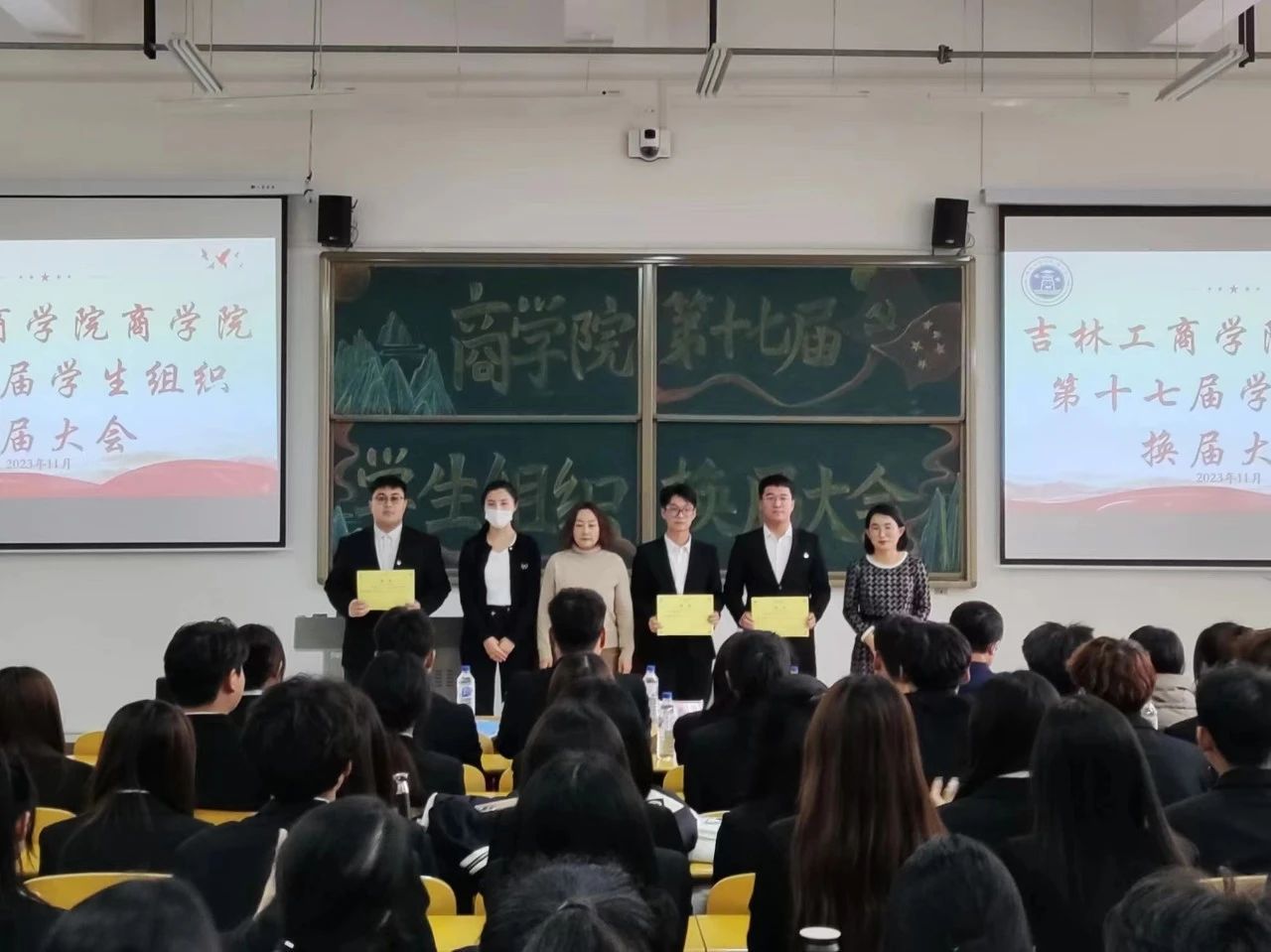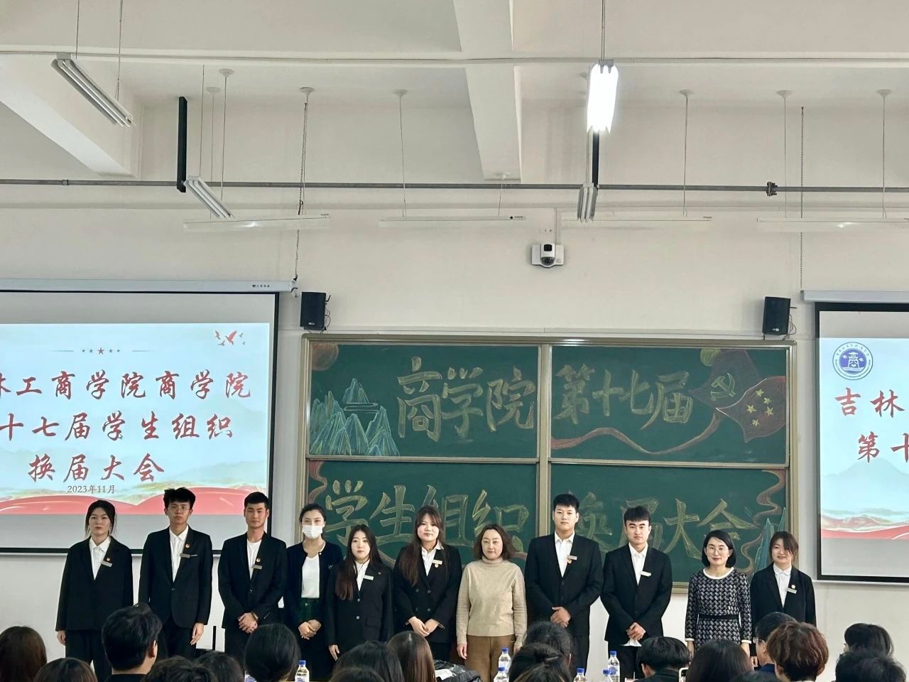 本次大会由乔春雨主持,商学院党委副书记尚香君、学团办主任于彩霞、学团办副主任李佳琳、辅导员老师徐万新、王欢、沈龙、吕自然、杨婷婷、王梦恬及全体学生干部参加本次会议。
