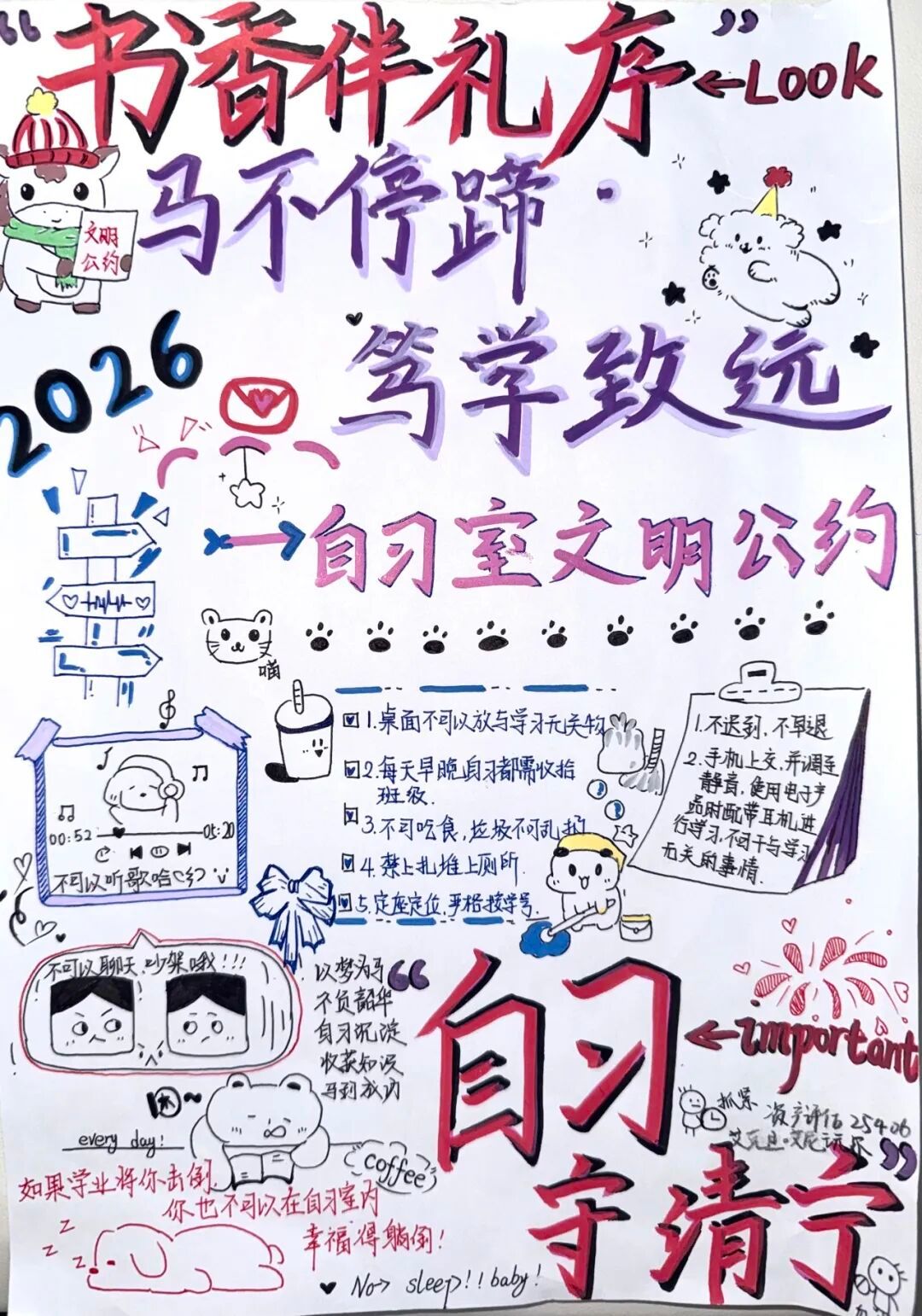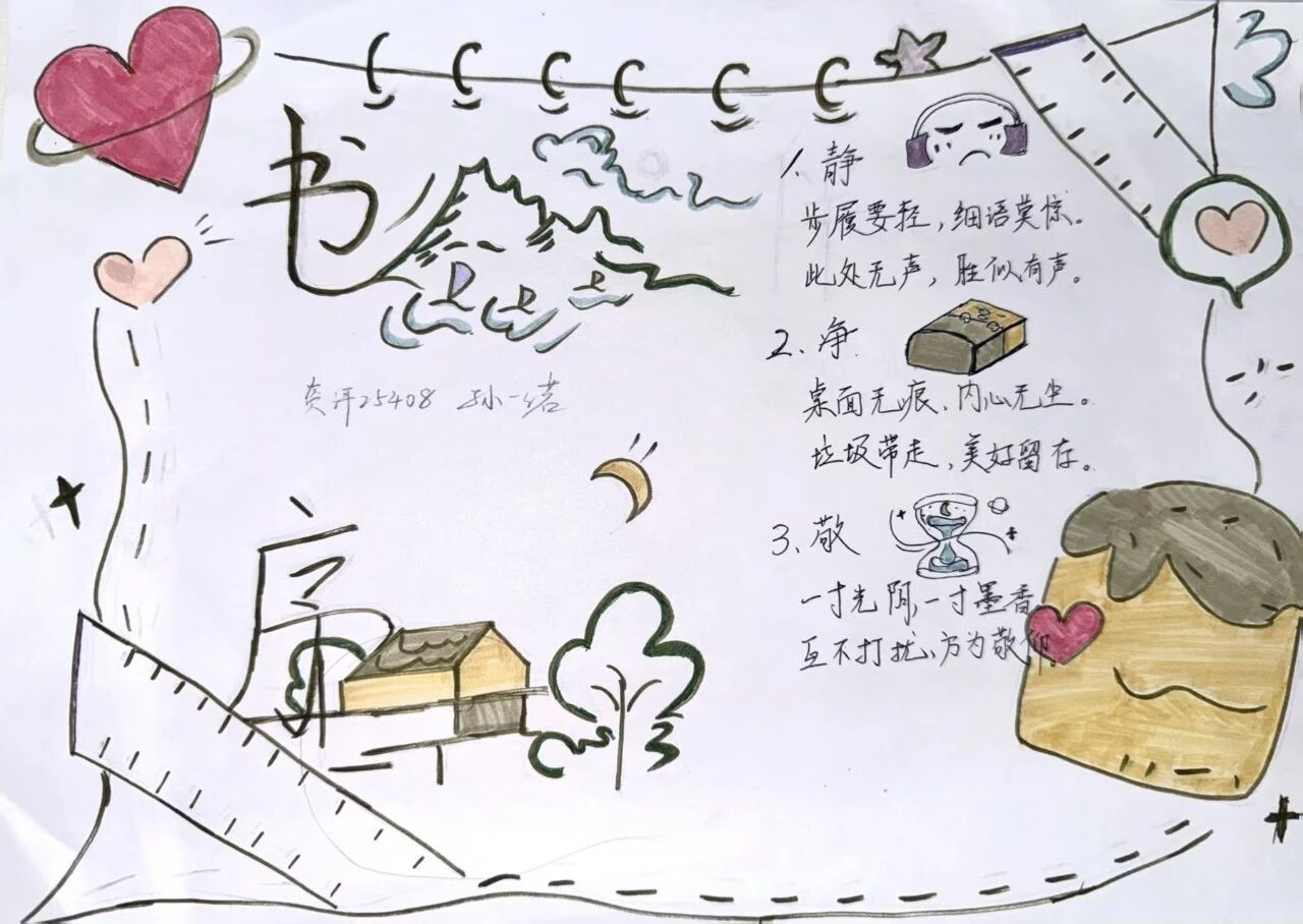 为深入推进学风建设,营造安静有序、专注高效的自习环境,引导学生养成文明自律的良好学习习惯,商学院开展“书香伴礼序 自习守清宁”自习室文明公约创意手账活动。本次活动以创意实践为抓手,凝聚学生共识,携手共筑美好学习空间。