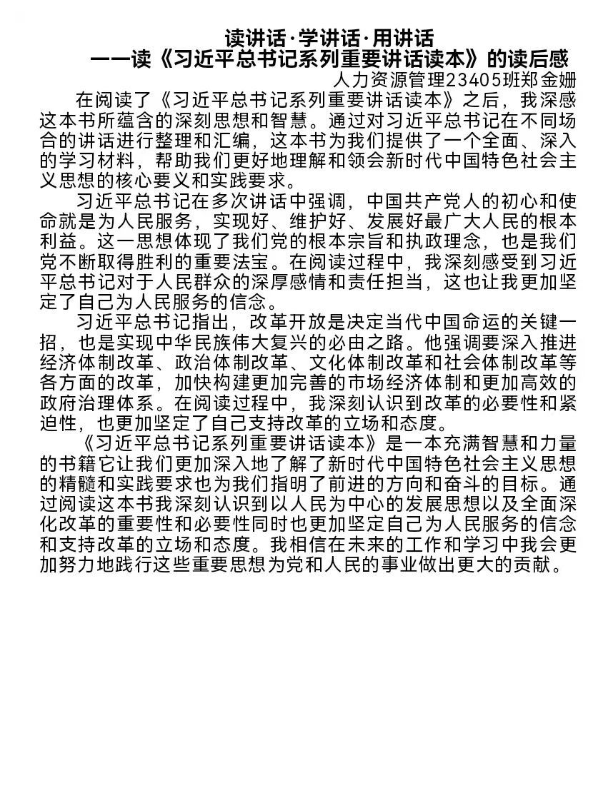 文字与思想交融,阅读与分享碰撞。本次读书分享会,激发了同学们的读书热情,营造了良好的交流学习氛围。学习新思想,建功新时代;生而逢盛世,青年当勇为,让我们用新思想作武装的武器,用青春活力充当前行的燃料,守正创新、砥砺奋进,续写历史新篇,创造辉煌佳绩!