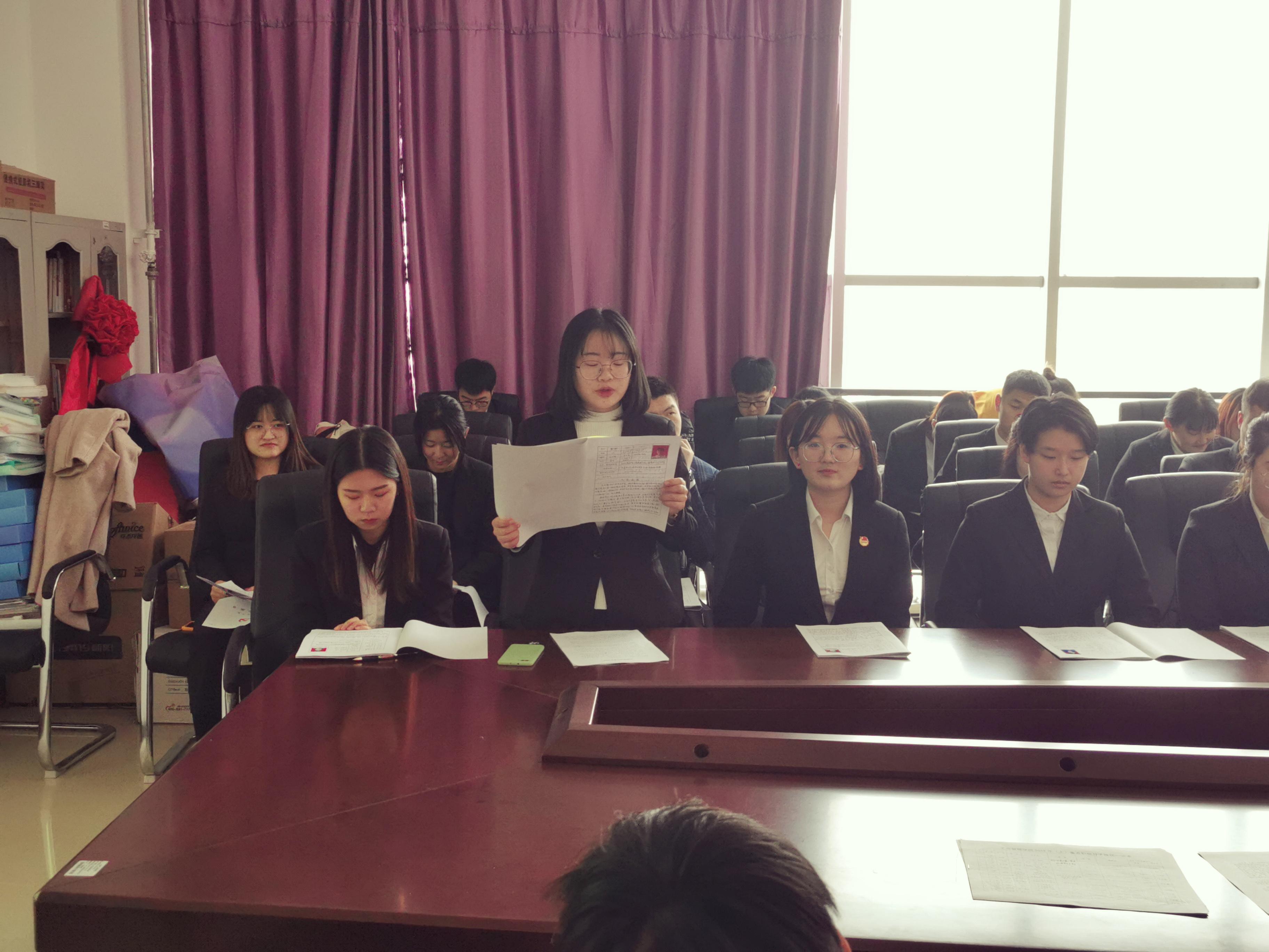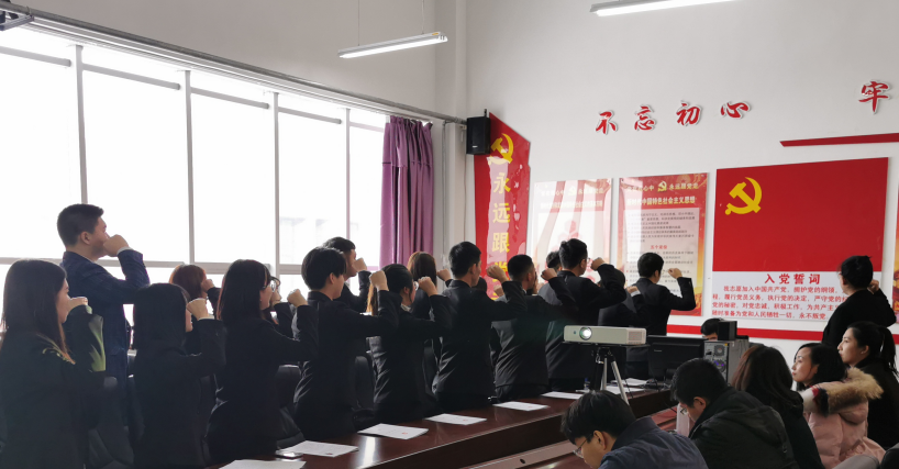 大会第一项是接收预备党员,讨论接收廖婕、梁梓淇等20名同学为预备党员。首先,由廖婕、梁梓淇等20名预备党员发展对象宣读了自己的入党志愿书。接着,大家依次汇报了个人的情况,指出了自己平时在生活和学习中的不足,阐述了自己对党的深刻认识,也向大会汇报自己一年考察期内在思想、学习、工作等方面的表现。最后,会上大家投票表决,一致同意廖婕、梁梓淇等20位同志成为预备党员。大会第二项,讨论王森陈、刘佳鑫等15名预备党员转正事宜,首先王森陈、刘佳鑫等15名预备党员宣读转正申请书,总结作为预备党员一年以来对党的深刻认识,阐述自己在预备期间的表现,也说出了自己的不足之处,并表示在以后的学习生活中,努力提升自己的党性修养,不断提高自己,做一名合格的优秀共产党员。接下来,于彩霞老师分别介绍王森陈、刘佳鑫等15名同志在预备期的培养教育情况,认为王森陈、刘佳鑫等15名同志在平日的学习和生活中积极努力、不断进步、乐于帮助他人,同意15名预备党员按期转正。最后,大家投票表决,一致同意王森陈、刘佳鑫等15名同志按期转为正式党员。大会第三项,由辅导员杨旭老师带领大家宣读了入党誓词:“我志愿加入中国共产党,拥护党的纲领,遵守党的章程,履行党员义务,执行党的决定,严守党的纪律,保守党的秘密,对党忠诚,积极工作,为共产主义奋斗终身,随时准备为党和人民牺牲一切,永不叛党”。大会最后,于彩霞老师就本次大会内容做出了总结性发言,对成为新党员以及预备党员的同学表示祝贺的同时,还提出了几点希望和要求,希望各位党员不忘初心跟党走,为同学服务,做学生表率,加强自我要求,发挥好党员先锋模范作用,取得更加突出的成绩。