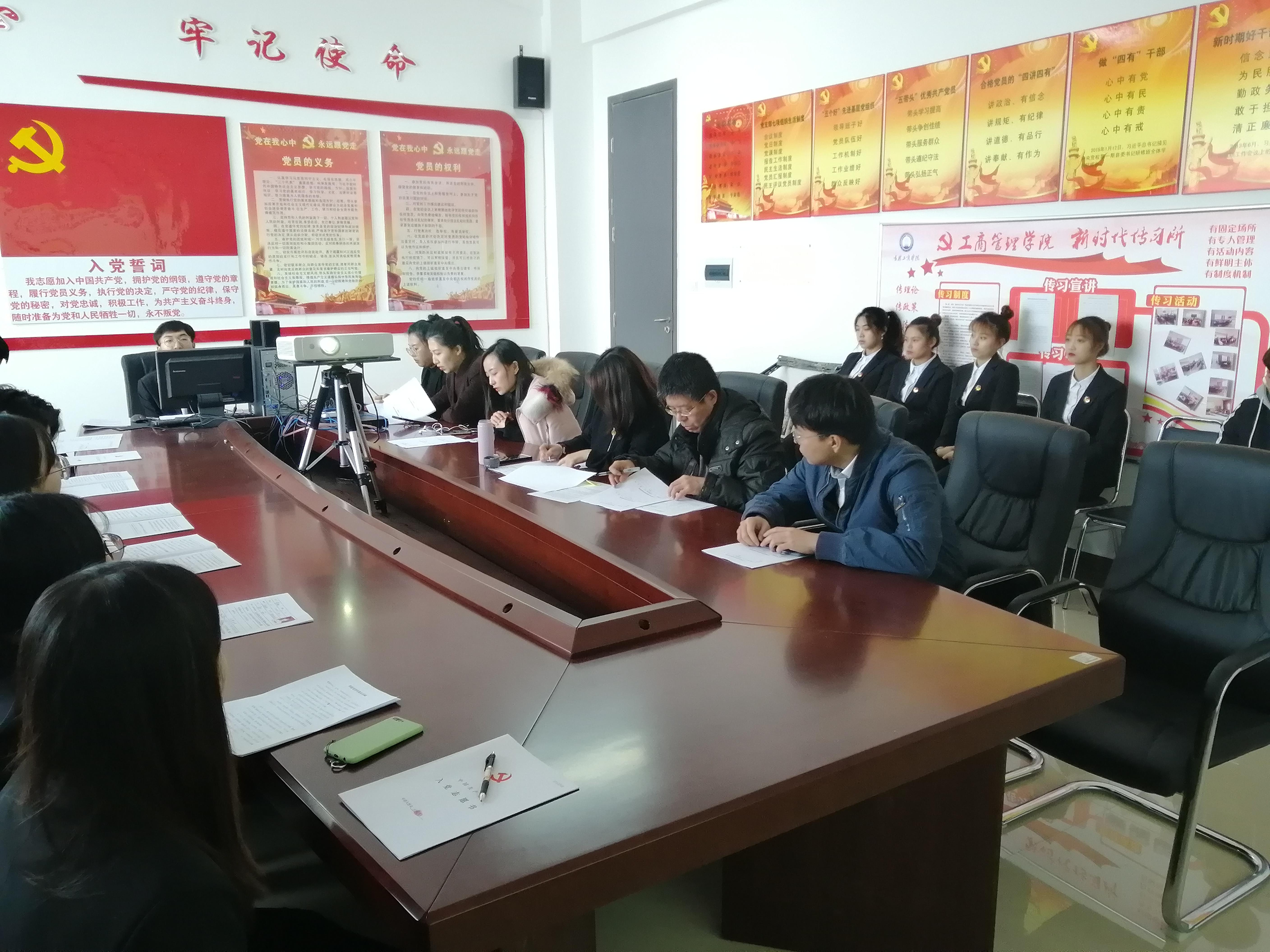 为推动“不忘初心、牢记使命”主题教育工作的开展,进一步加强对学生党员的教育考察,工商管理学院于2019年12月11日在二教A区522召开了接受新党员暨预备党员转正大会。工商管理学院分团委书记于彩霞,辅导员徐万新、李娜、李星举、李佳琳、杨旭以及学生党员等共计30余人参加了本次大会。本次会议由分团委书记于彩霞主持。