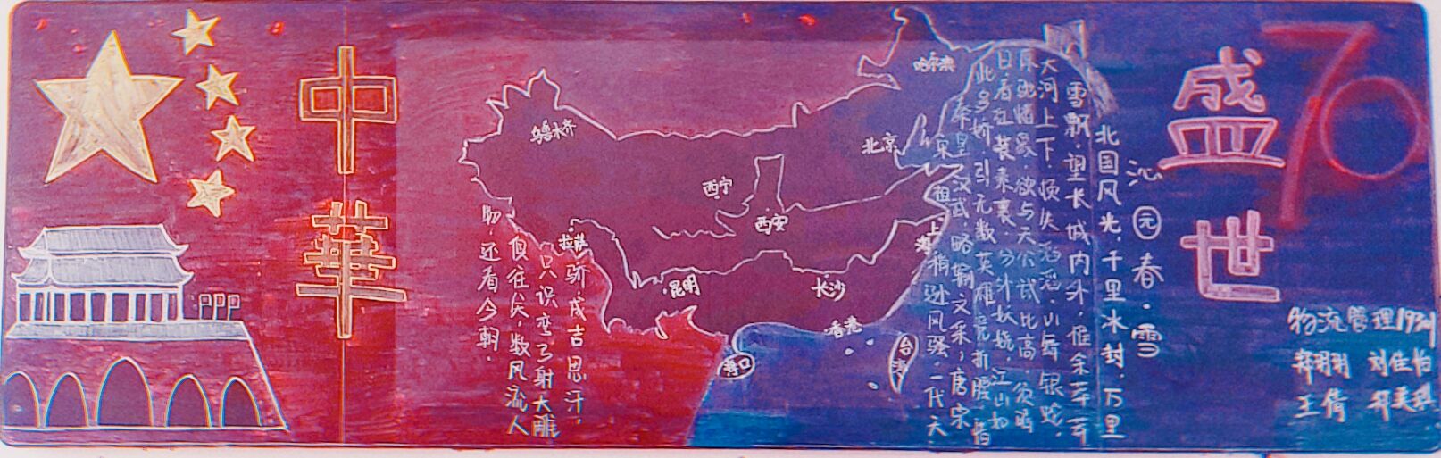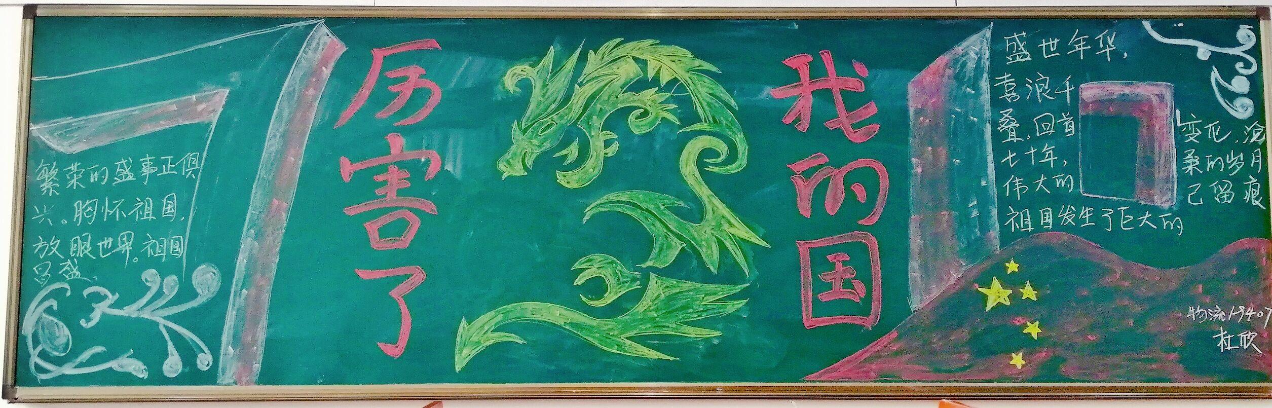 本次活动在各班宣传委员的策划下,班级每位同学都积极参与其中,各班提交的黑板报作品都紧扣主题,结合当代大学生的创新意识,用一幅幅靓丽的黑板报作品展示了祖国的大好河山。从整体来看,各班的黑板报创意新颖、图文并茂、色彩搭配自然和谐,极具感染力。板报内容充实,充满吸引力,展现了当代大学生积极向上的精神面貌和校园文化生活,增强了当代青年大学生的民族自豪感,表达了当代大学生对祖国的热爱之情。