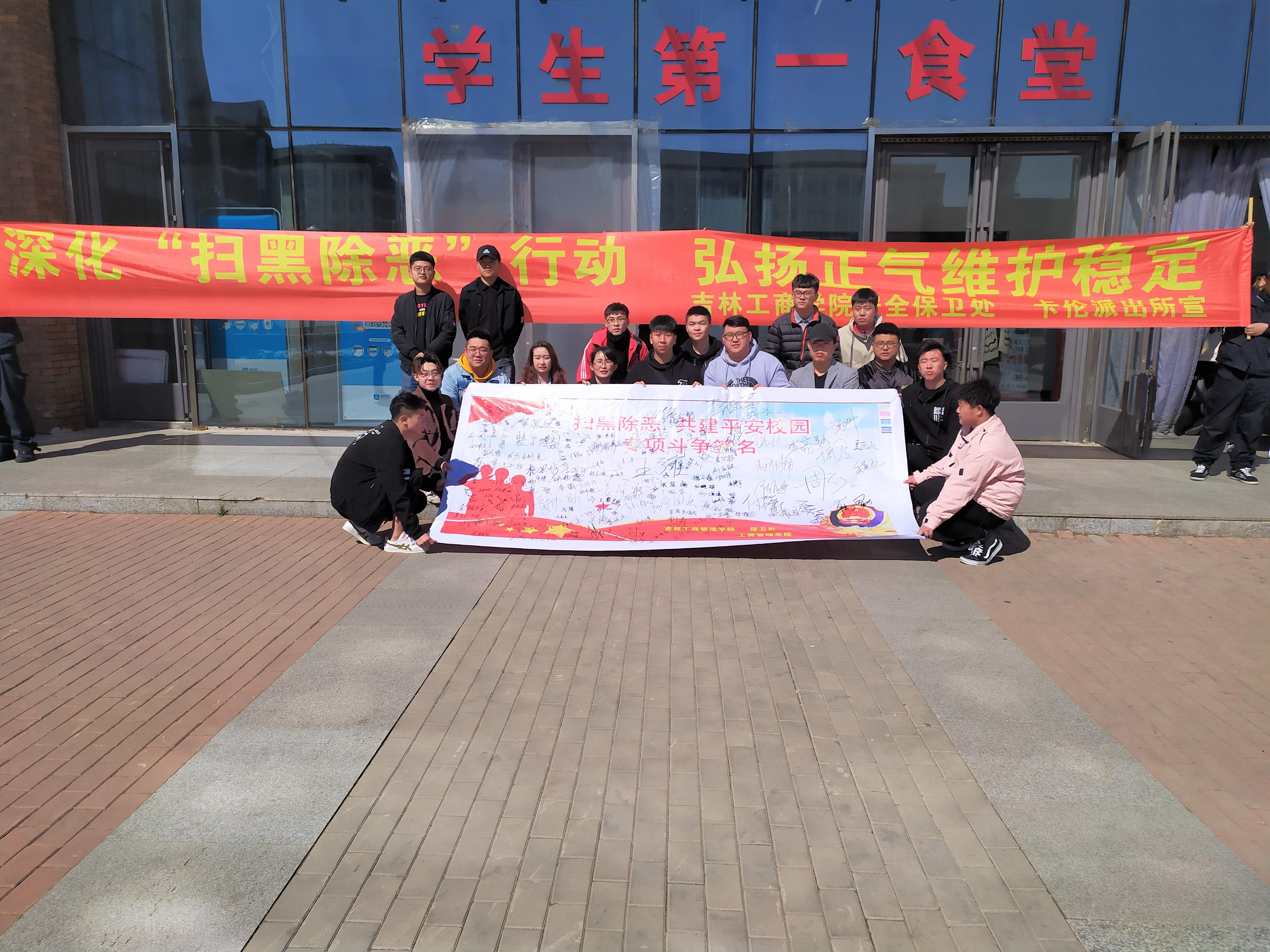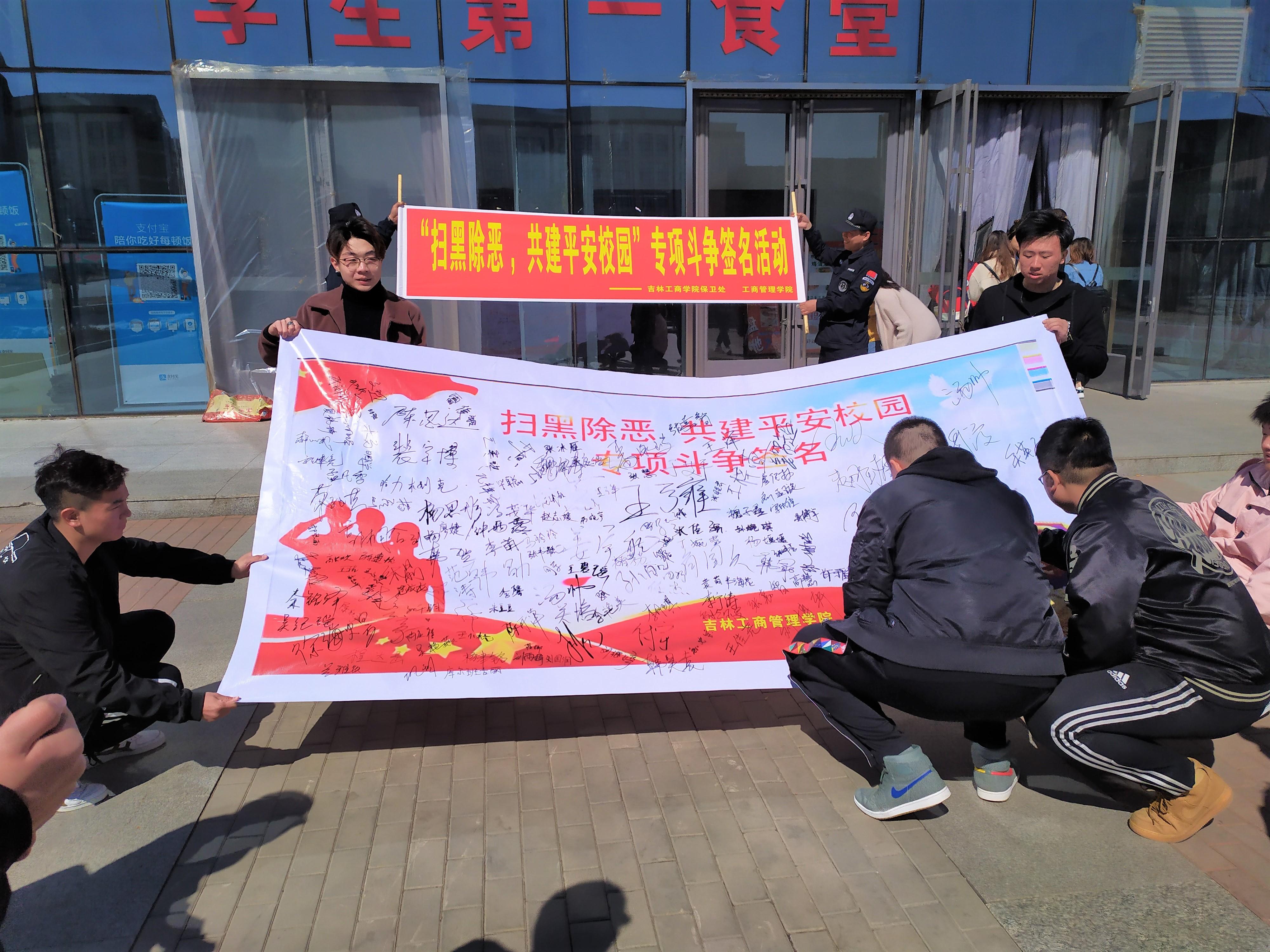 为增强学生们的自我防范意识,加大扫黑除恶力度,营造良好的学习氛围,工商管理学院与学校保卫处联合于2019年3月28日中午在我校一食堂门口举办了“扫黑除恶,共建平安校园”专项斗争签名活动。
