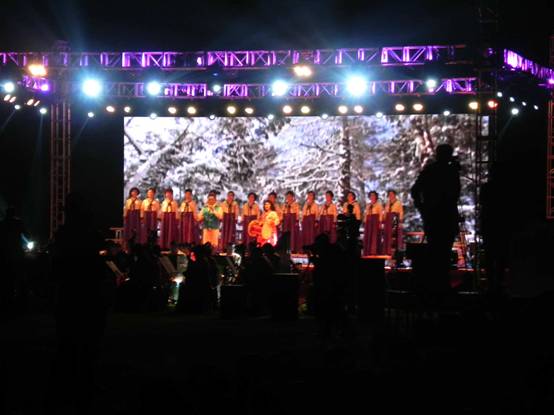 晚上的体育场灯光闪耀,热闹非凡。工商管理学院的新生早早就已经在操场上落座,秩序井然地等待晚会的开始。联欢晚会在气势磅礴的合唱《南海,南海,中国海》中拉开序幕。晚会不仅有民乐合奏《庆典序曲》的独具韵律,庄严无比;而且有舞蹈《保卫黄河》将民族舞蹈配上节奏鲜明的音乐,充分散发出大学生对祖国母亲的忠诚与热爱;更有现代舞《fine by me》点燃了全场观众的激情,赢得了不断的呐喊声、鼓掌声;为纪念剧版《红楼梦》演出三十年,晚会特别推出组曲《序曲》和《红豆曲》,将全场观众带入一个古风古韵,古色古香的情境之中。晚会最后在合唱《创造新世纪》中圆满落下帷幕。