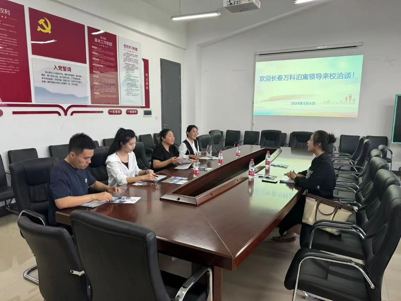9月4日上午,长春万科泊寓人力资源部负责人唐晶来到商学院进行校企合作洽谈。商学院党委书记张智静、学团办主任于彩霞、副主任李佳琳,辅导员沈龙出席本次会议,双方就开展校企合作及学生就业等相关问题进行了深入的交流与探讨。