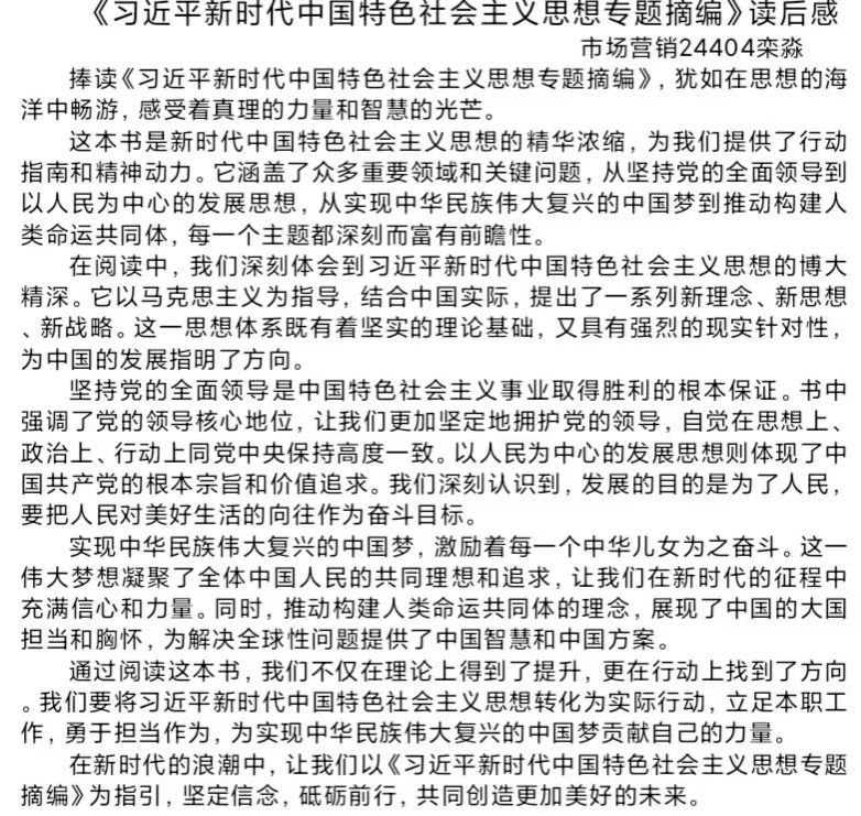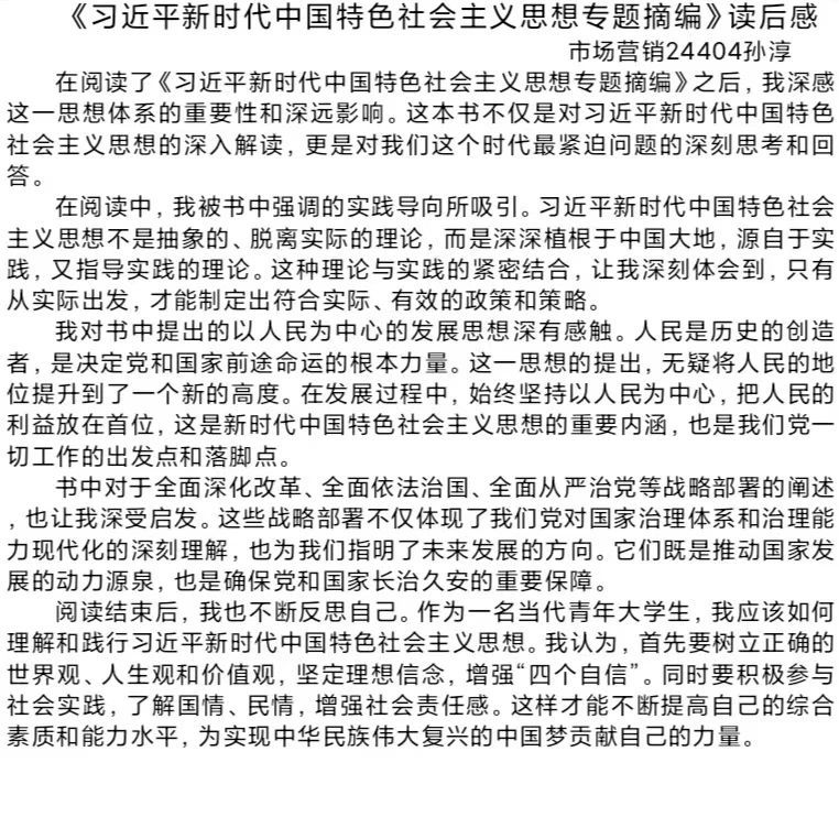 文字与思想交融,阅读与分享碰撞。本次读书分享会,激发了同学们的读书热情,营造了良好的交流学习氛围。学习新思想,建功新时代;生而逢盛世作为青年当勇为。让我们用新思想作武装的武器,用青春活力充当前行的燃料,守正创新、砥砺奋进,续写历史新篇,创造辉煌佳绩。