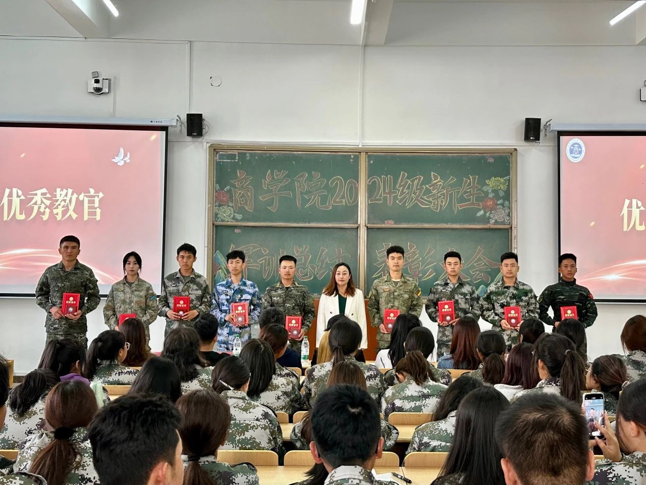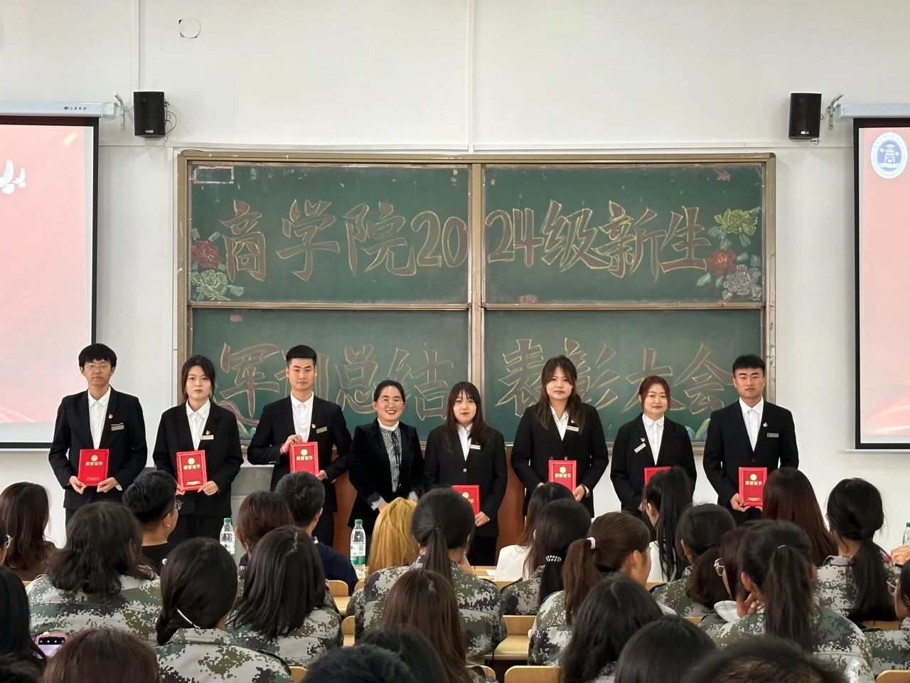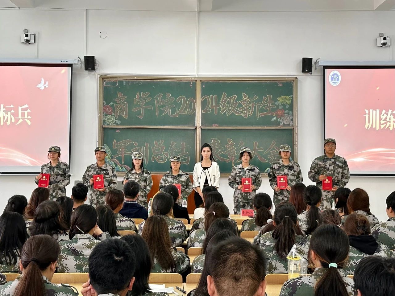 商学院党副委书记尚香君,学团办主任于彩霞、学团办副主任李佳琳,辅导员徐万新、王欢、张天宇、王梦恬、杨婷婷,军训教官、学生干部及全体新生出席此次表彰大会,会议由沈龙主持。