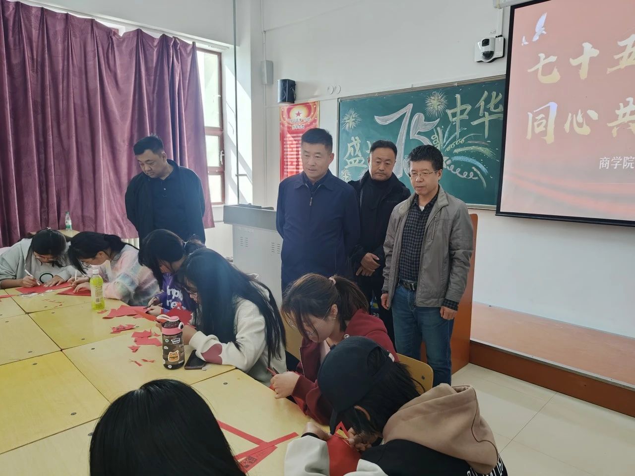 本次活动由商学院辅导员徐万新带领同学们参加,活动作品主题围绕国庆元素,以五星红旗、天安门、长城等图案为创作灵感。同学们的剪纸作品不仅展示了高超的技艺,更饱含了对祖国的深厚情感。活动中,还特别设立了互动环节,鼓励大家相互交流剪纸经验,分享创作感悟。
