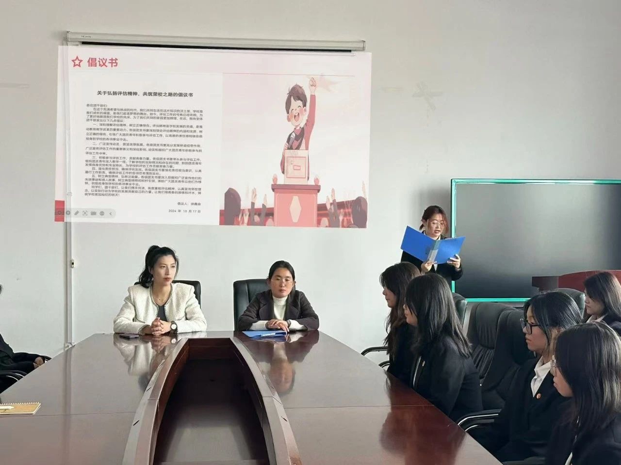 大会最后,商学院分团委副书记徐鑫淼向各级团支书宣读倡议书。她倡议,商学院的学子们应以积极向上的态度迎接即将到来的本科教育教学评估工作,深入理解本科教育教学评估工作的核心精神,从而树立正确的价值导向。每一位同学都应增强责任感和使命感,确保本科教育教学评估工作的实际效果,避免形式主义。同时要求各位团干部要通过树立典型榜样,积极弘扬正能量,从而为学校的整体发展贡献自己的力量。这不仅鼓舞了在场的每位团干部,也为广大团员青年树立正确的价值导向。