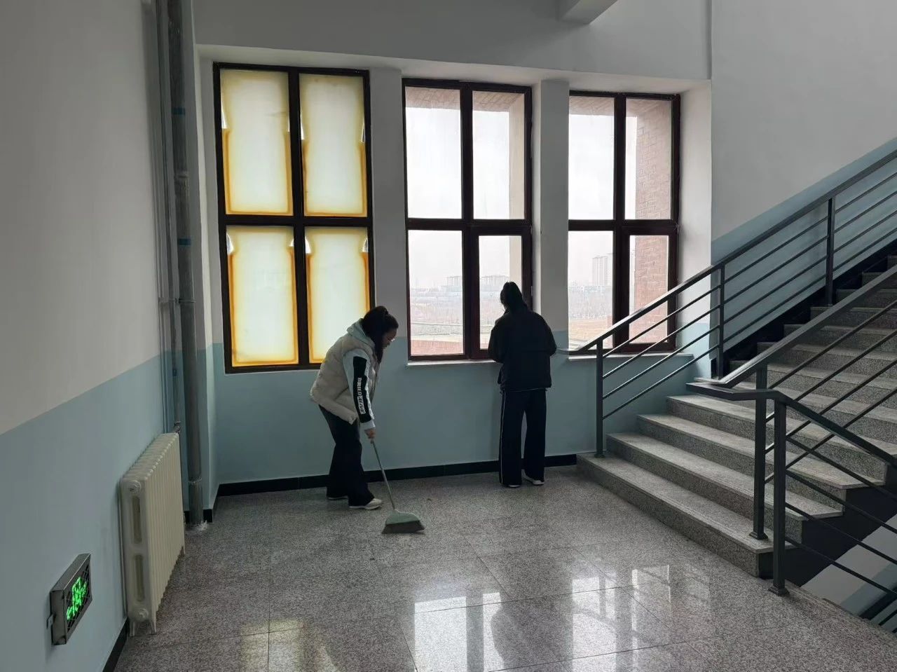 商学院志愿者团队在校园内开展清扫工作。志愿者们在教学楼内重点清理烟蒂、卫生死角和楼道杂物,保障楼宇环境整洁有序,志愿者们认真细致地检查每一个角落,以饱满的热情投入到清扫工作中。
