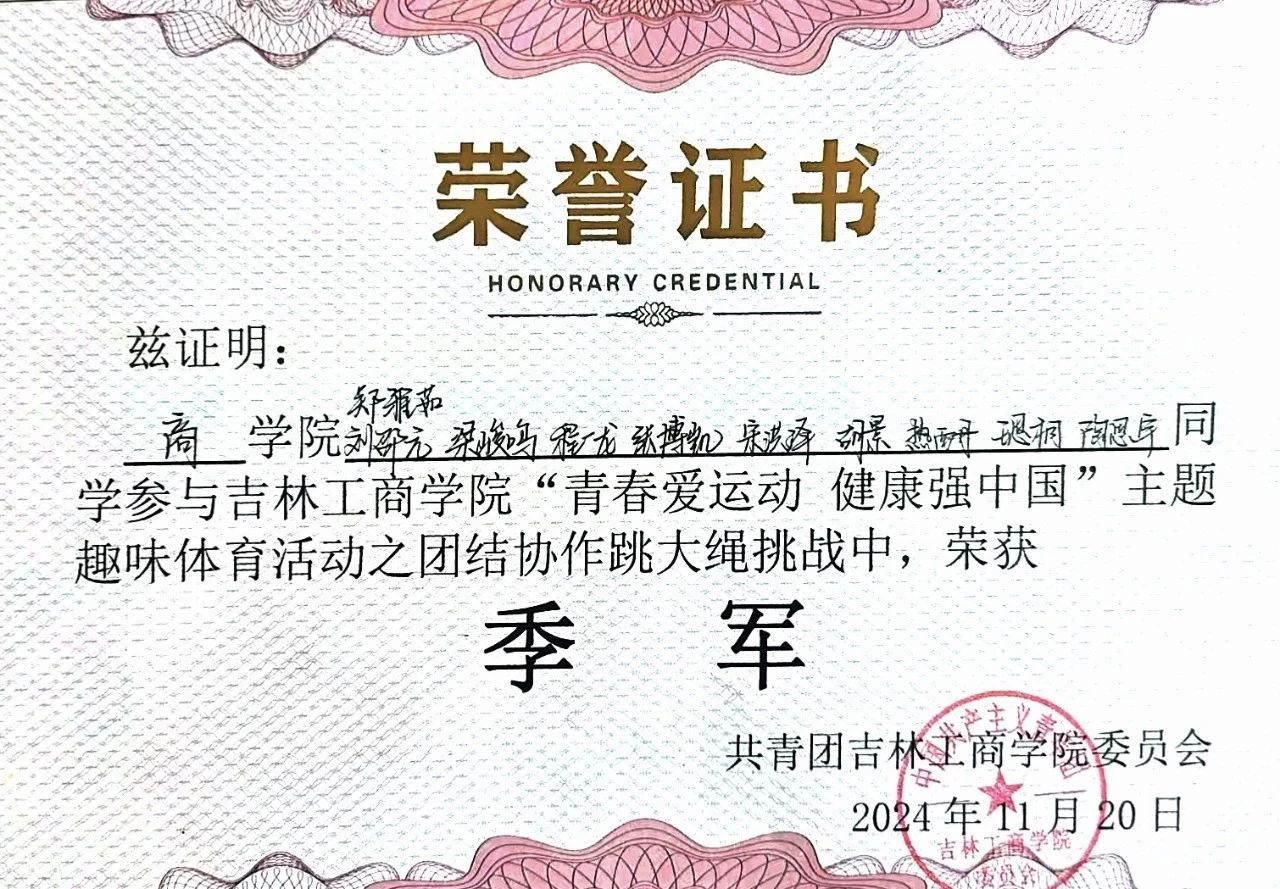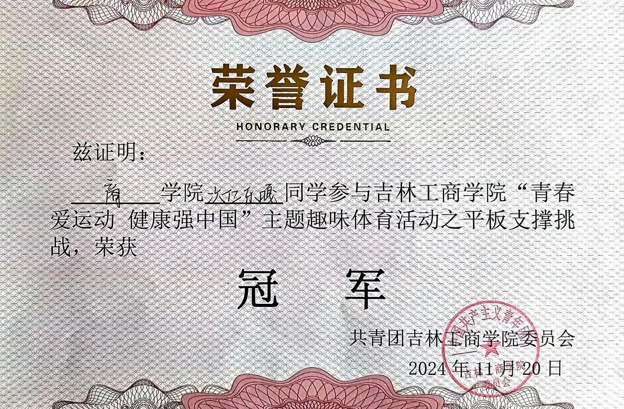 2024年吉林工商学院“青春爱运动,健康强中国”主题趣味活动于11月20日在二操场圆满落下帷幕。商学院团体跳绳、平板支撑代表以卓越的表现,从众多参赛队伍中脱颖而出,分别荣获了团体赛季军与个人赛冠军的佳绩。