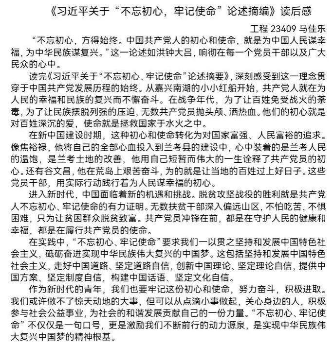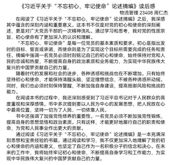 分享会上,同学们积极围绕书籍《习近平关于“不忘初心,牢记使命”论述摘编》,进行交流分享。他们深刻认识到“不忘初心、牢记使命”是每一位党员应具备的基本素质,新时代青年应以民族复兴为使命,坚定理想信念,勇挑时代重担,在为人民服务中践行初心使命,不辜负时代、青春以及党和人民的殷切期望。