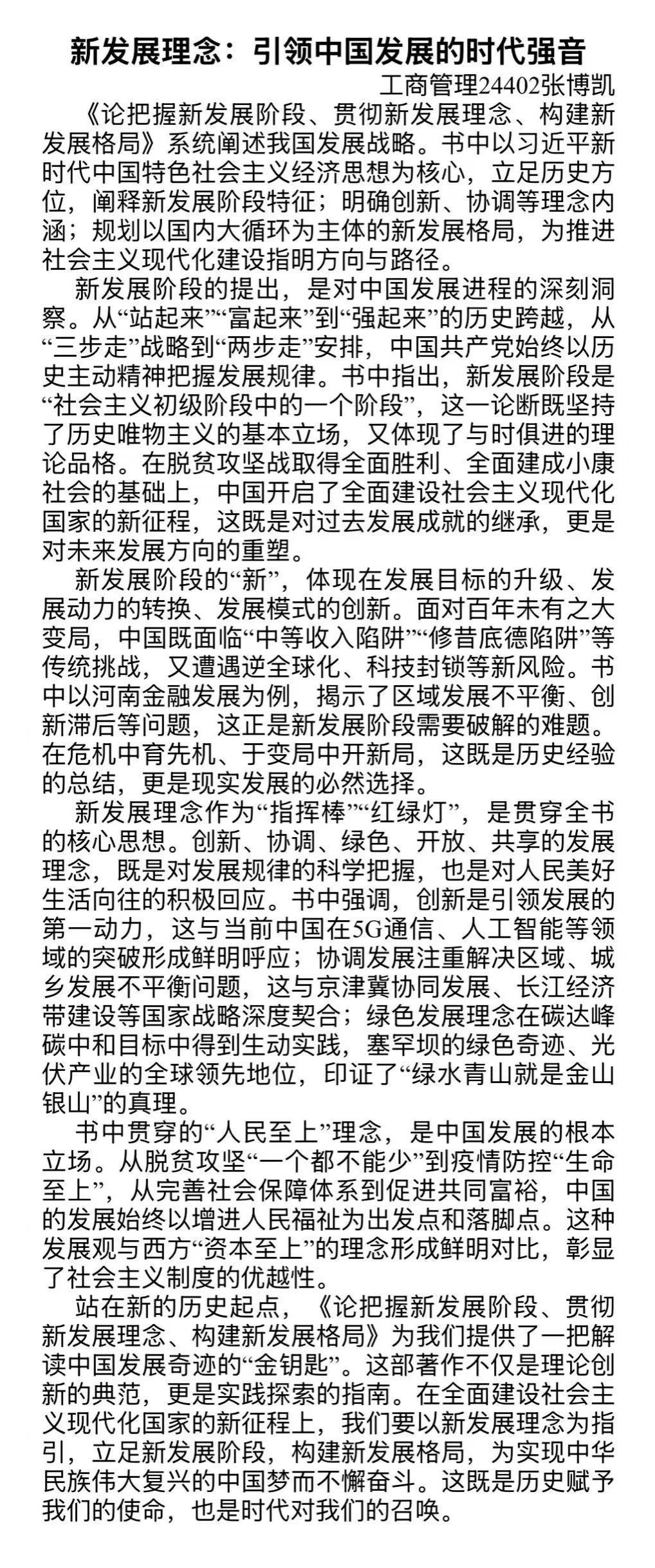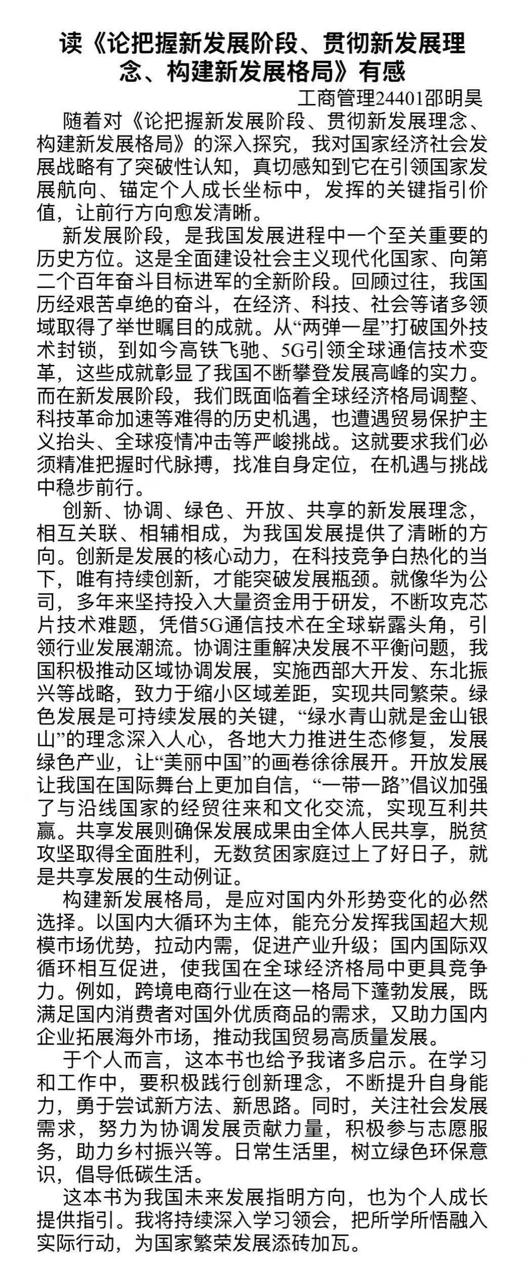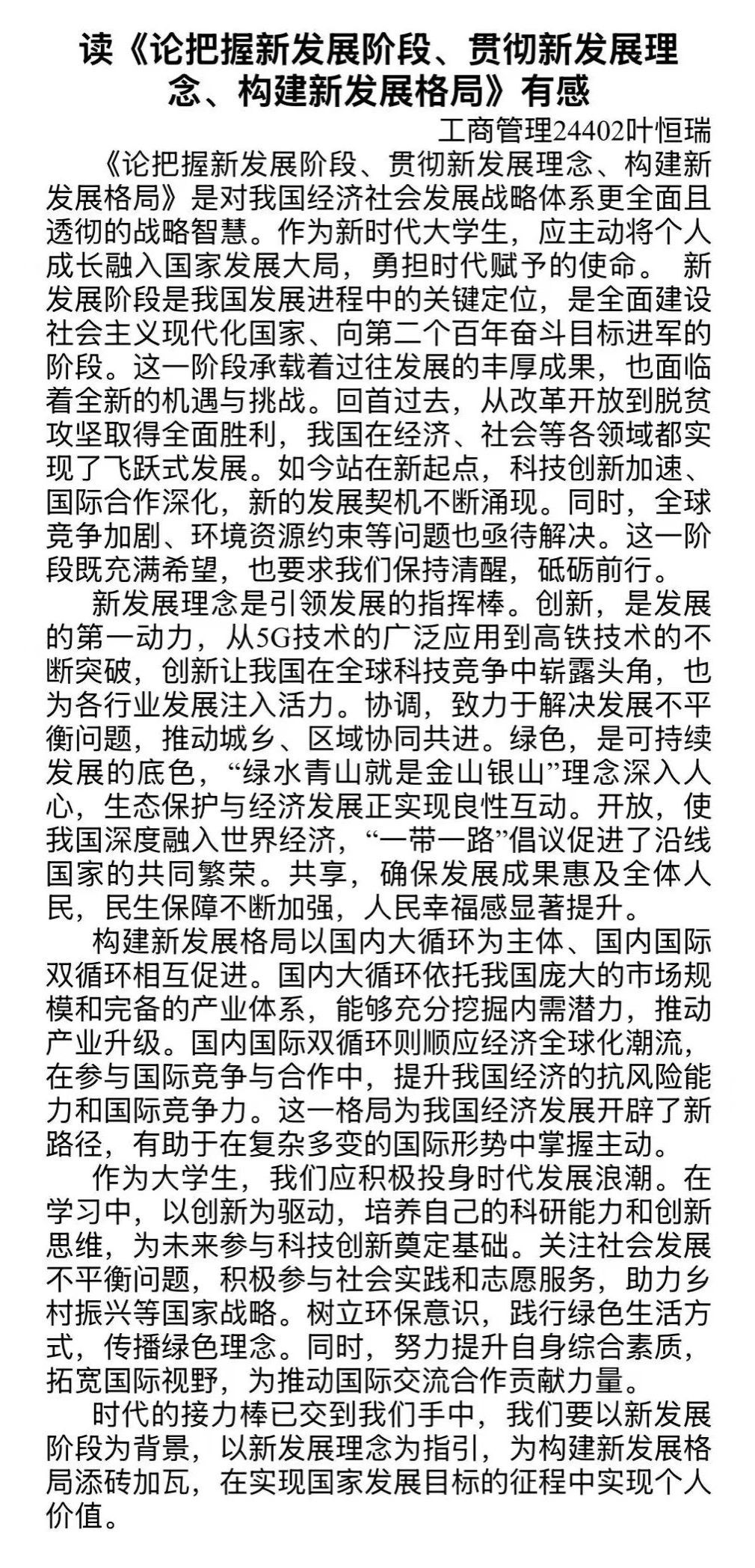 在《论把握新发展阶段、贯彻新发展理念、构建新发展格局》学习分享会上,同学们结合自身学习实际展开了热烈讨论。通过深入交流,大家深刻认识到,习近平新时代中国特色社会主义思想,不仅为青年学子指明奋斗方向,提供追梦的舞台,更激发奋进的青春力量,引领我们在追求美好生活、奔赴民族复兴的征程中,以青春之我践行使命,将思想伟力转化为成长动力。