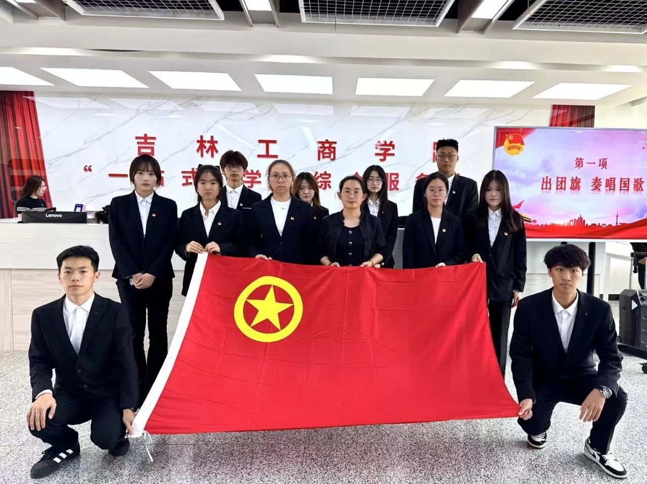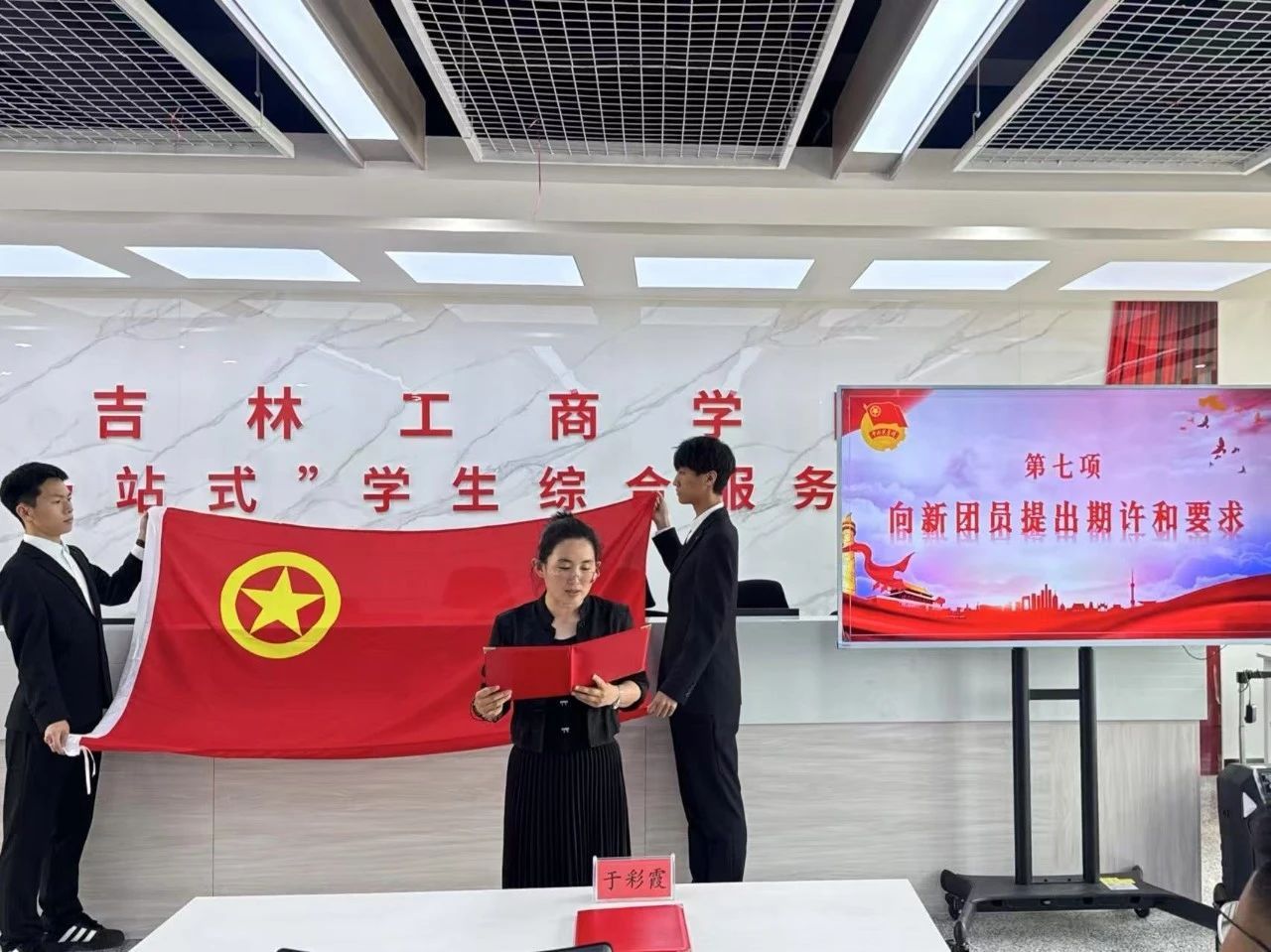 为深入贯彻党的二十大和二十届二中、三中全会精神,学习习近平新时代中国特色社会主义思想,引领青年学子坚定理想信念,勇担时代使命。商学院于6月13日在吉林工商学院“一站式”学生社区服务中心举行新团员入团仪式。商学院团委书记于彩霞出席并主持入团仪式,全体新团员参加。