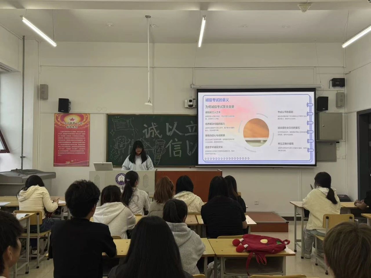 在主题班会上,各班精心准备,展开诚信教育宣讲。宣讲内容分为四个维度:首先深入阐释诚信应考的核心价值,其次剖析考试作弊的多重危害,再次提供诚信践行的具体路径,最后辅以正面典型示范。宣讲过程中,同学们不仅援引《学生手册》中关于考试违纪的处理条款,更结合真实案例进行警示教育;同时通过播放专题视频,生动展现诚信品质的深远意义。班会尾声,全体同学郑重签署诚信考试倡议书,以庄严承诺践行考风考纪,让诚信成为求学路上最坚实的基石。