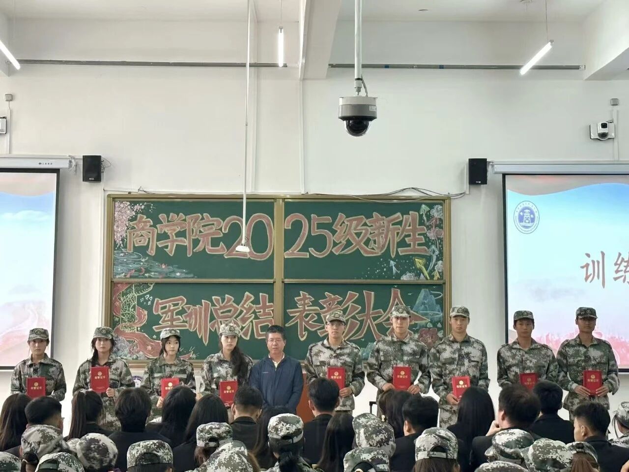 大会伊始全体参会人员起身肃立,行注目礼,奏唱《义勇军进行曲》。与会人员共同观看军训总结短片,镜头回顾新生在训练场打磨队列、休息时互助鼓劲、寝室中整理内务的片段,串联军训点滴,唤起师生共同回忆。辅导员徐万新宣读《关于表彰商学院2025级新生军训期间文明寝室、优秀寝室、标杆寝室、训练标兵及优秀指导员的决定》,辅导员杨婷婷为“文明寝室”及“优秀寝室”颁发证书,辅导员王欢为“标杆寝室”颁发证书,辅导员徐万新为“训练标兵”颁发证书与奖品,党委副书记尚香君为“优秀指导员”颁发证书与奖品。