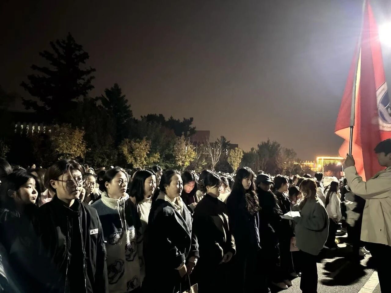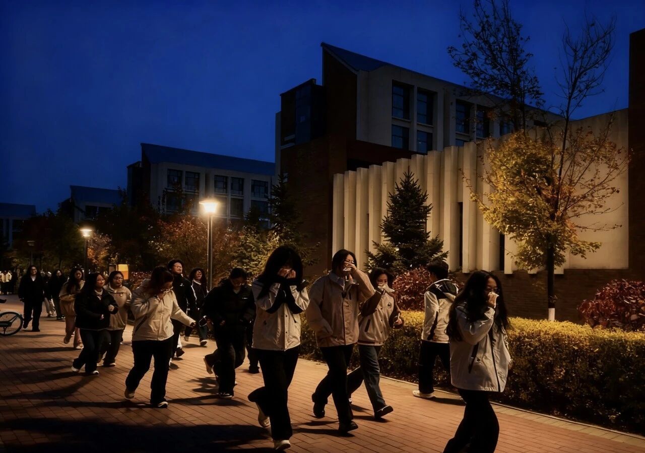夜间应急演练实操环节中,现场以模拟真实火情为场景开展突发应急疏散。在工作人员的引导下,参与人员均以湿毛巾遮蔽口鼻、保持低姿行进,确保全程无慌乱拥挤现象,并沿规定逃生路线快速、安全疏散至指定安全区域。疏散完毕后,学生干部立即清点人数并上报信息,确保演练各环节衔接闭环。