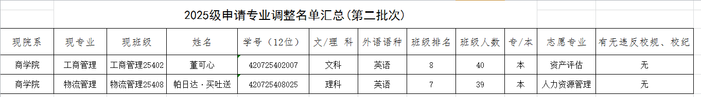 商学院 2025级申请专业调整名单汇总(第二批次)
