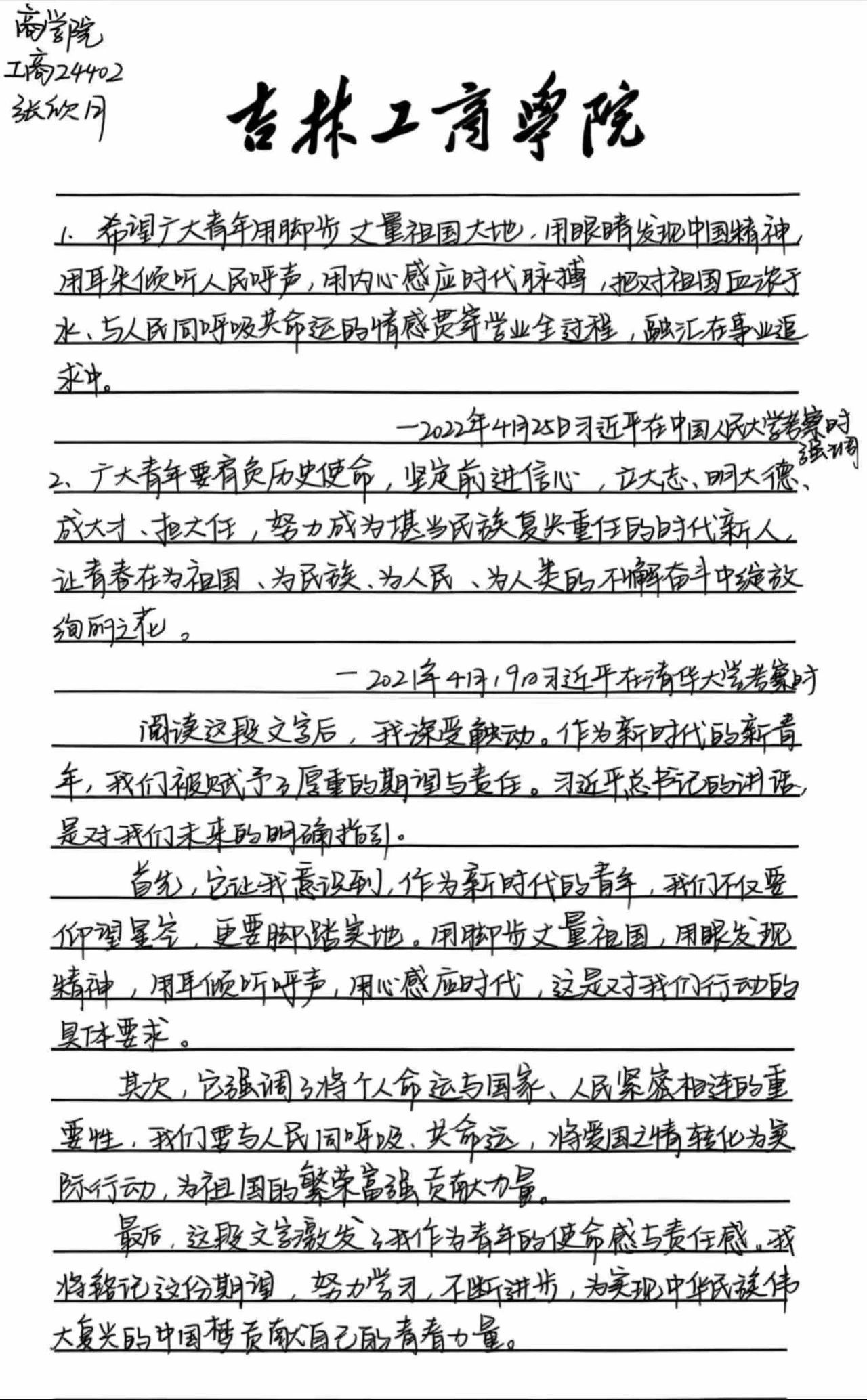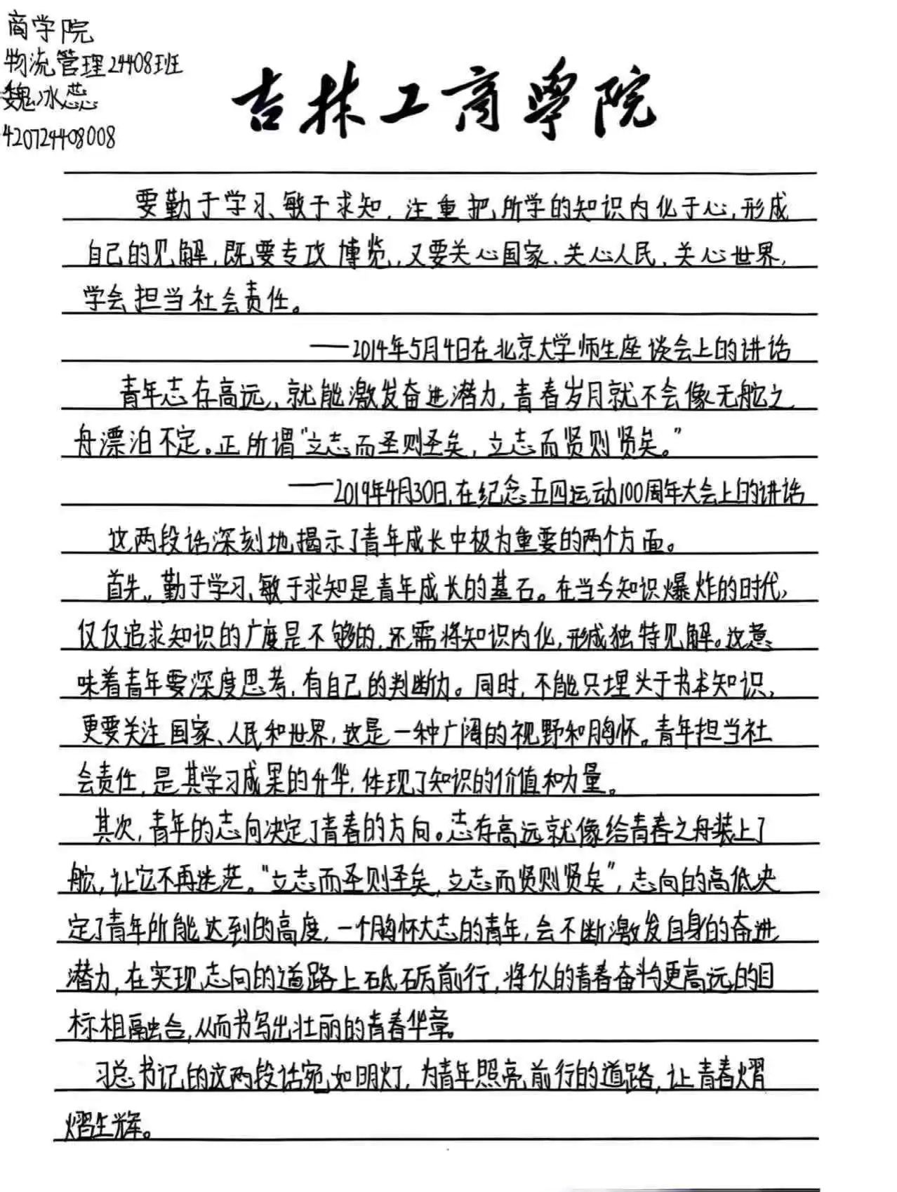 此次活动,以摘抄习近平总书记重要讲话及文章内容的形式,着力引导青年学生树立正确的世界观、人生观、价值观。广大青年要将个人理想与国家命运紧密结合在一起,为实现中华民族伟大复兴的中国梦不懈奋斗。
