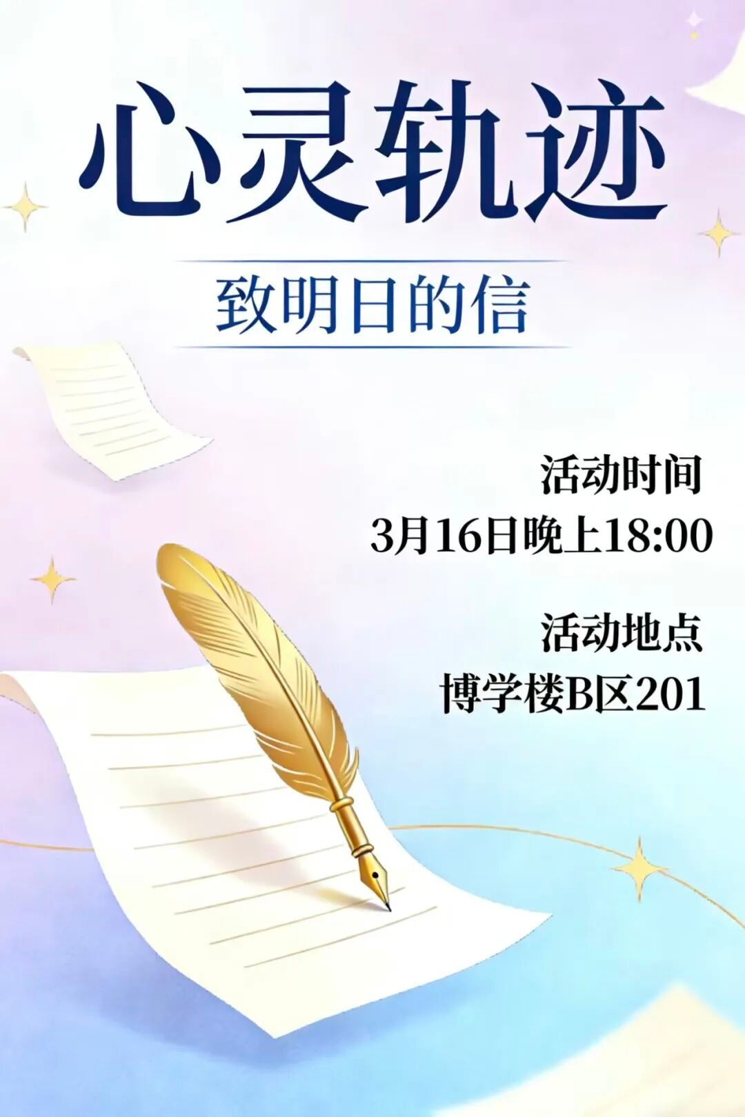 商学院将于3月16日(星期一)晚上18:00,在博学楼B区201教室举办“心灵轨迹·致明日的信”主题书信寄存活动。