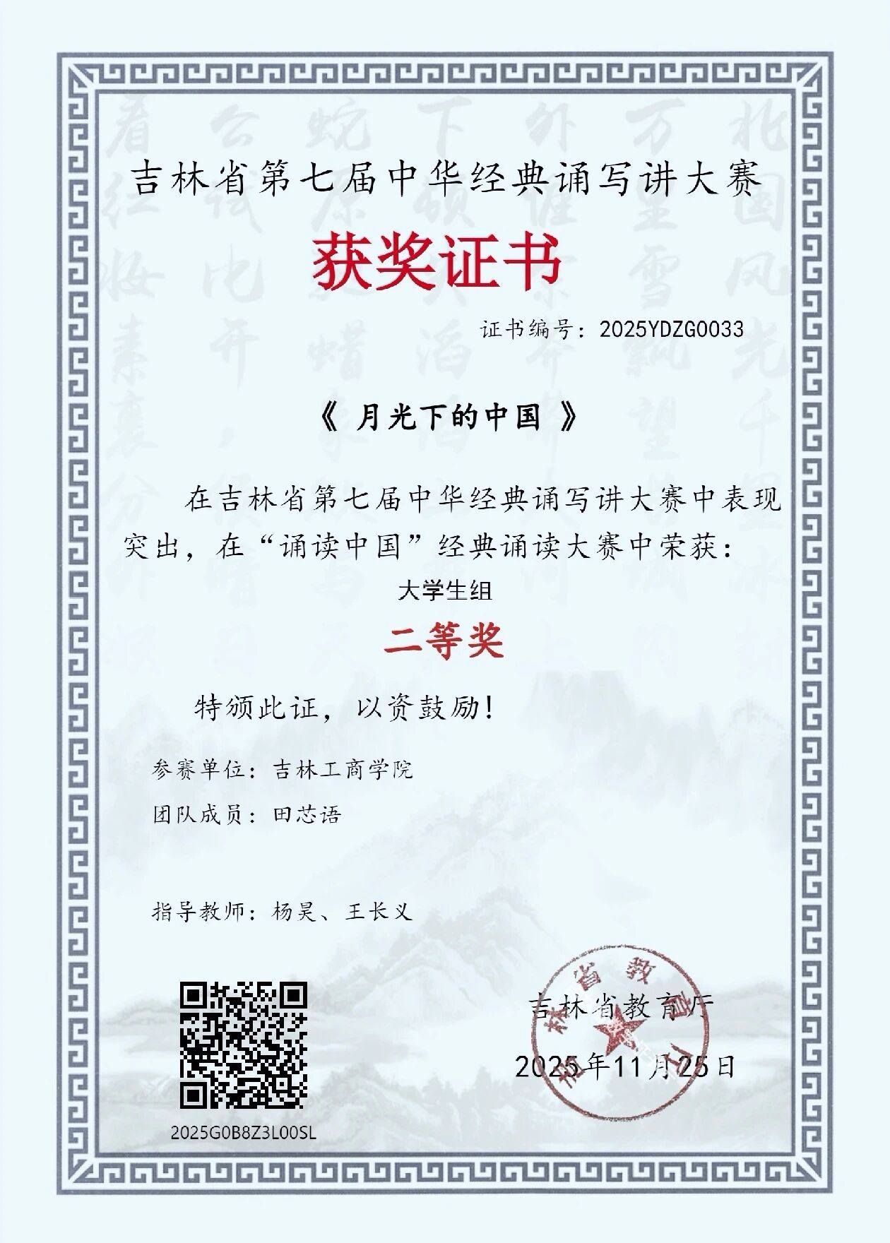 由辅导员老师杨昊、王长义指导的《月光下的中国》,以诗意表达绘就家国盛景。作品以舒缓深情的语调铺展中华大地的壮阔与温润,将个人情感与家国情怀深度交融,于娓娓道来中勾勒出山河无恙、国泰民安的时代图景。